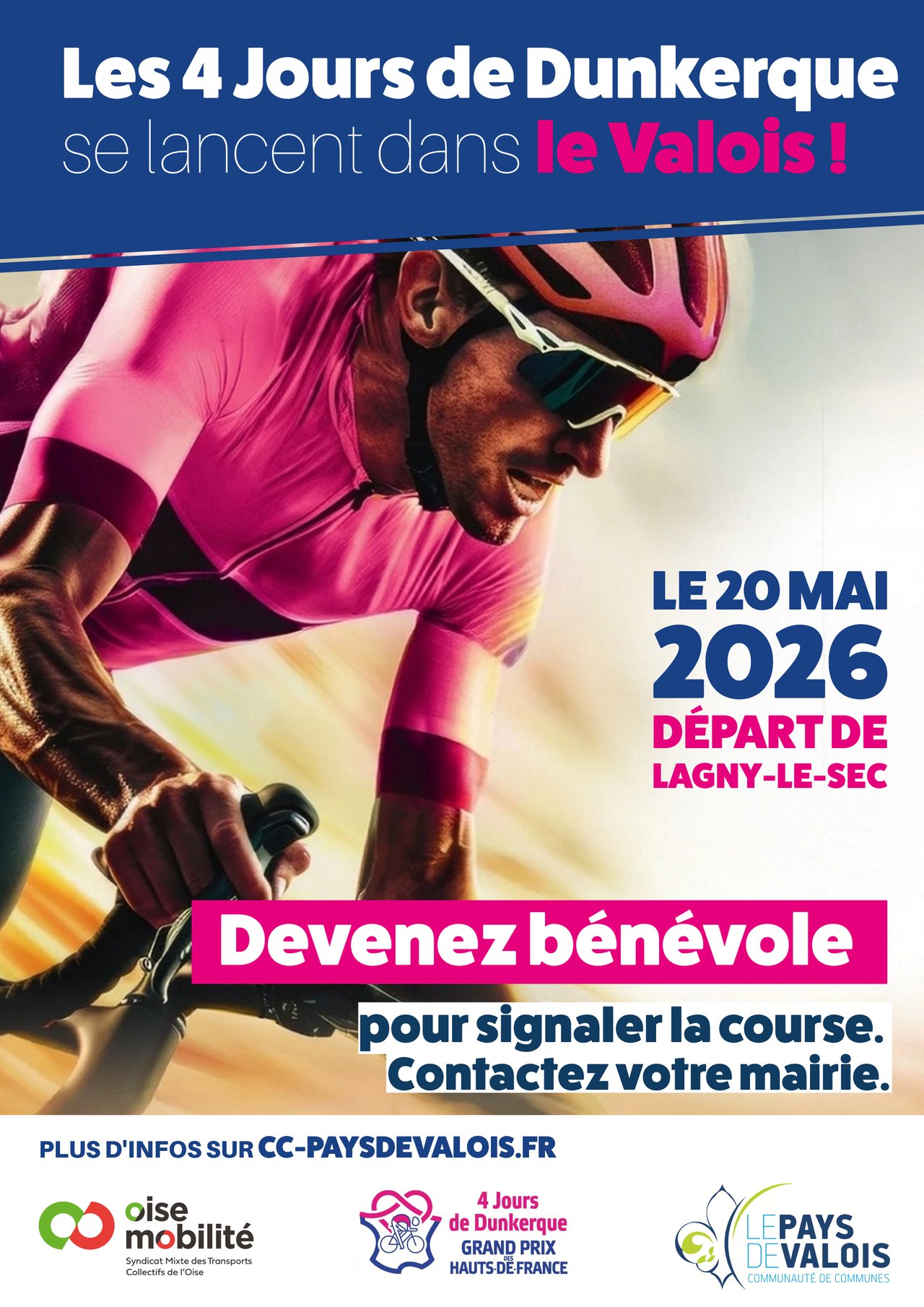 À l’occasion du passage des 4 Jours de Dunkerque dans le Pays de Valois, la communauté de communes lance un appel à bénévoles pour participer à l’organisation de cet événement sportif d’envergure.